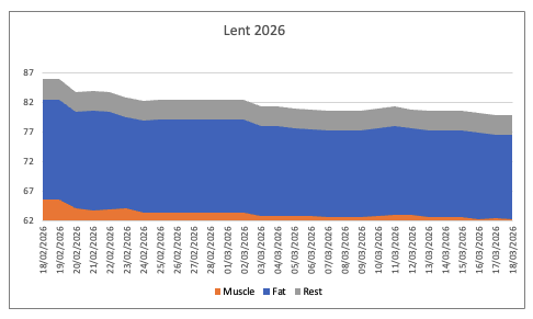 At the beginning of Lent, I was 85.9kg of which 20.2% (17.1kg) was fat and 75.8% (64.1kg) was muscle. Today I am 79.8kg of which 17.8% (14.2kg) is fat and 78.1% (62.3kg) is muscle. Of course, these fat and muscle figures are estimates. I’d need to go and immerse myself in a water bath to get accurate ones. But essentially, I’ve lost 6.1kg and 2.9kg of fat.